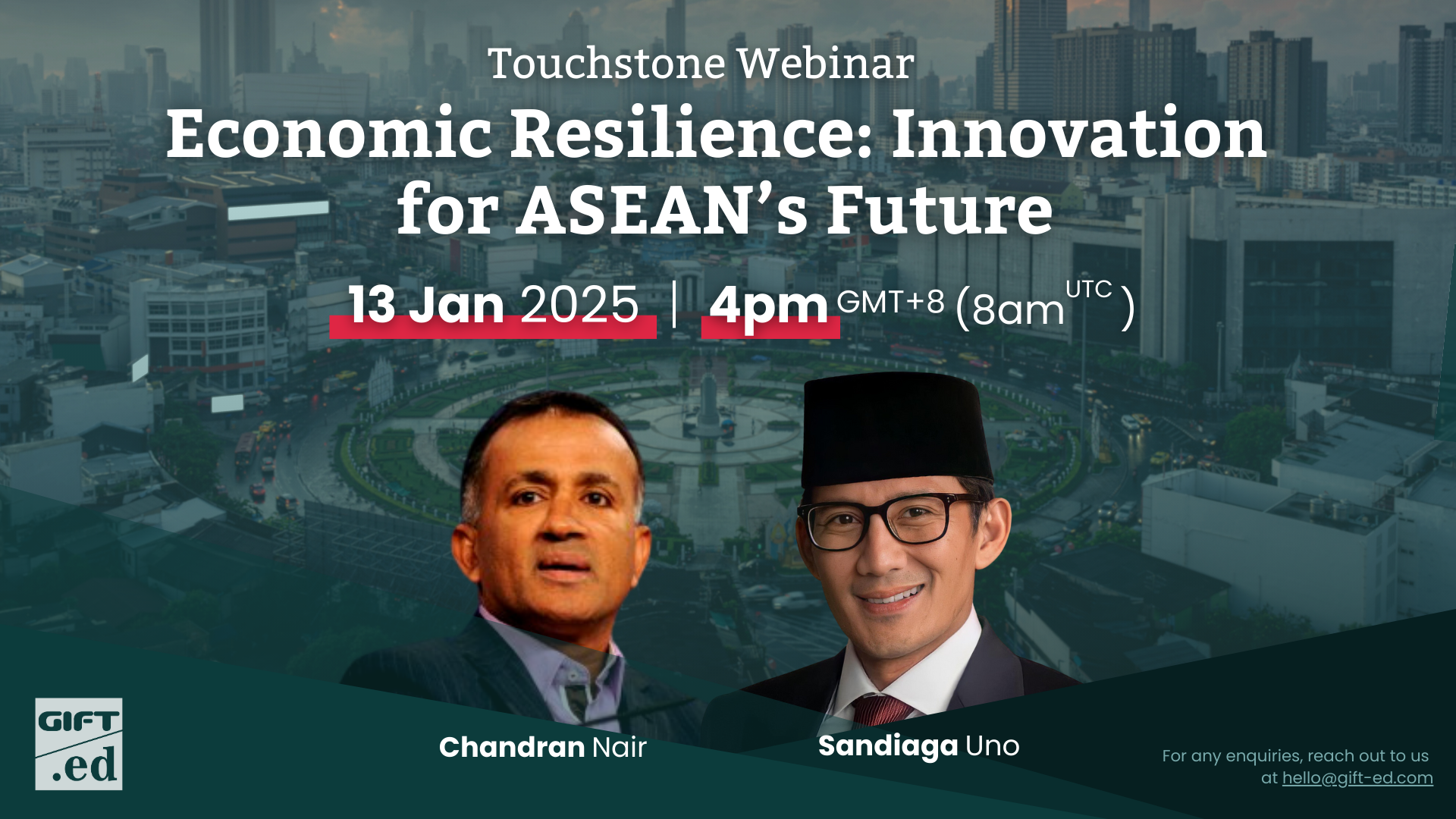 This inaugural session brings together Sandiaga Uno, former Minister of Tourism and Creative Economy of Indonesia, and Chandran Nair, renowned thought leader and founder of the Global Institute For Tomorrow (GIFT) and GIFT.ed, for a compelling exchange on Economic Resilience: Innovation for ASEAN's Future.